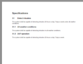 This SysML (1.2) Requirements Model contains three requirements in a package called "Specifications". "Detect intruders" is broken down into two more specific requirements: "All weather conditions" and "24/7 operation".